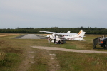 Med fulle tanker, feriebagasje og levert flightplan og melding til Tollvesenet, var vi i luften klokken 12:45. Været var nydelig, nesten skyfri himmel og lite vind. Vi satte kursen mot Drammen hvor vi fikk klarering til 5500 fot mot Åsgårdstrand mellom Torp og Rygge kontrollsoner. Svenskegrensen passerte vi 8 mil nord for Strømstad og så var det bare å følge kystlinjen sørover. Gøteborg Control klarerte oss inn i Gøteborg TMA ved Hällevikstrand, og ved Hönö satte vi kursen sørvestover mot rapporteringspunktet MAKUR. Etter noen få minutter passerte vi grensen til Danmark og kunne begynne å forberede innflygning til flyplassen. Vi kunne nok ha valgt en noe kortere rute og gått mer direkte mot øya, men med to barn ombord, ville jeg ikke fly lenger over åpent hav enn nødvendig. Vinden hadde etterhvert frisknet på fra vest og da vi landet på bane 25 hadde vi 15 – 20 knop rett i nesen. Etter en kort oppbremsing, takset vi inn til parkeringen hvor det forøvrig var flere norske fly å se, blant andre Bergen Flyklubbs nye C-172, og ”NAF-flyet”.